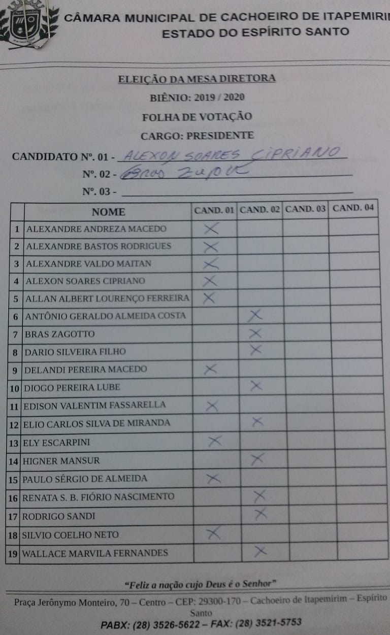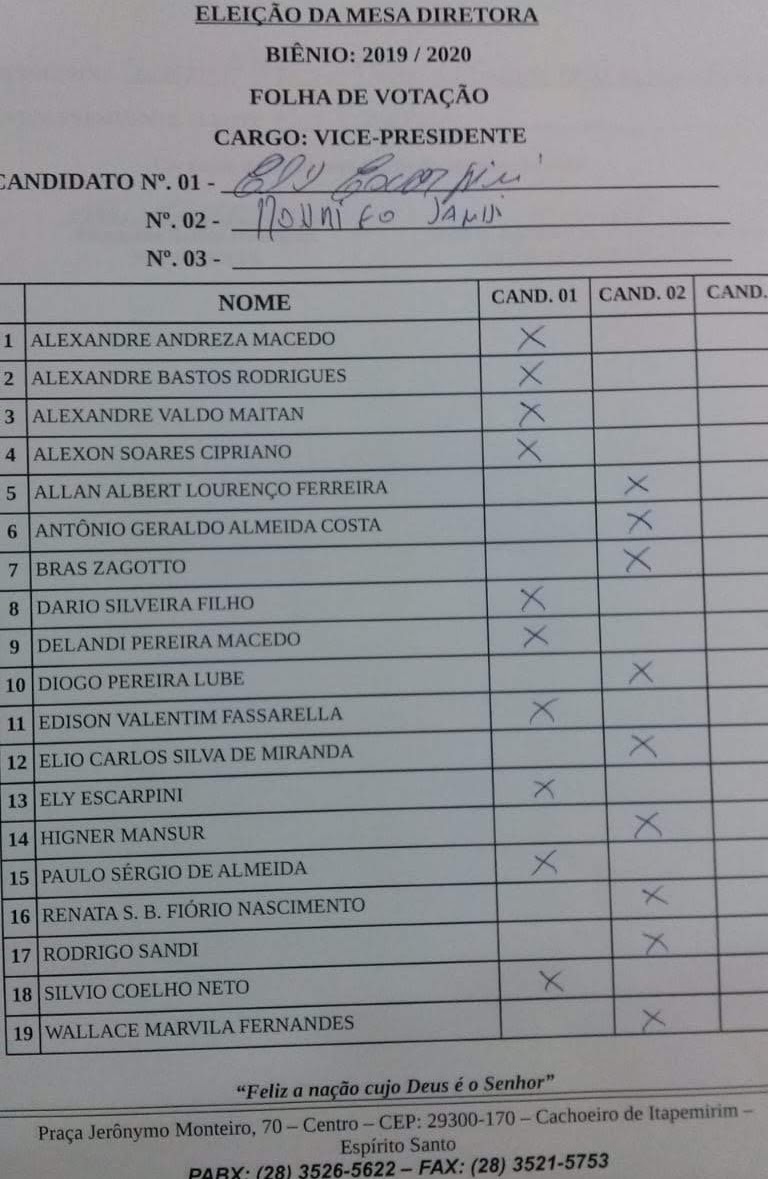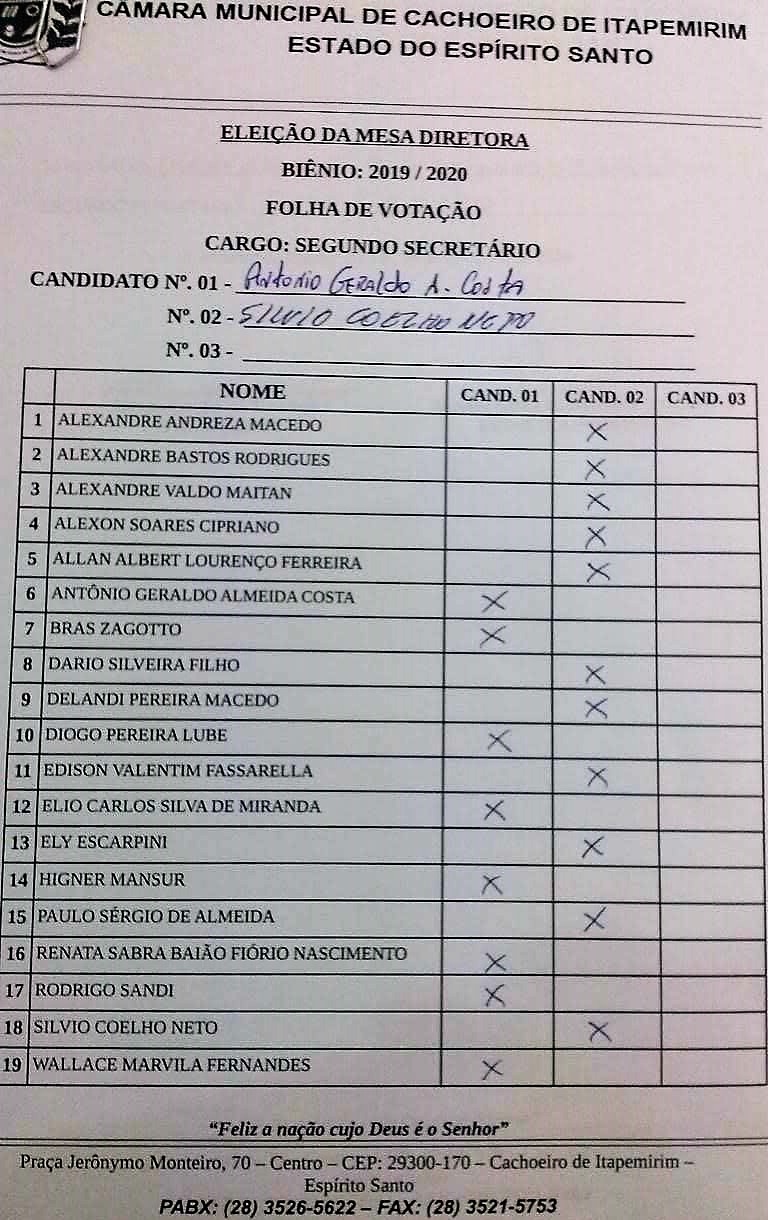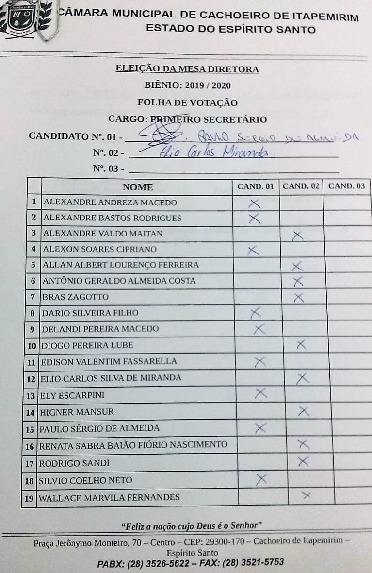 Ementa: ELEIÇÃO DOS CARGOS QUE COMPÕEM A MESA DIRETORA DA CÂMARA MUNICIPAL DE CACHOEIRO DE ITAPEMIRIM PARA O BIÊNIO 2019/2020
